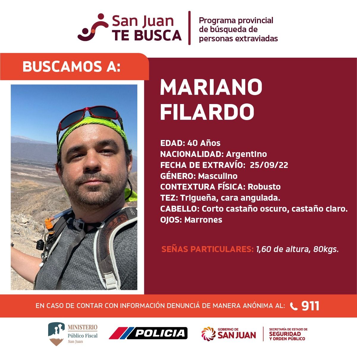 Este lunes por la mañana, desde el Programa Provincial de Búsqueda de Personas Extraviadas emitieron un comunicado por la desaparición de un sanjuanino de 40 años.