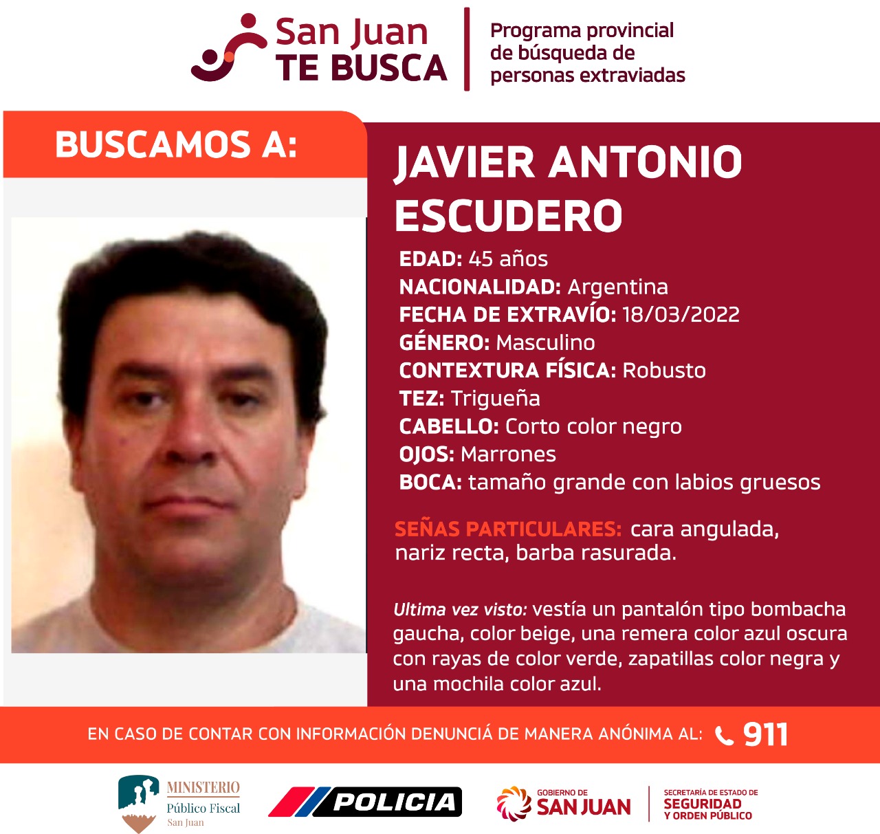 Mediante un comunicado, el Programa provincial de búsqueda de personas extraviadas informó que buscan a un hombre de 45 años, quien desapareció hace tres días de su domicilio de Pocito.