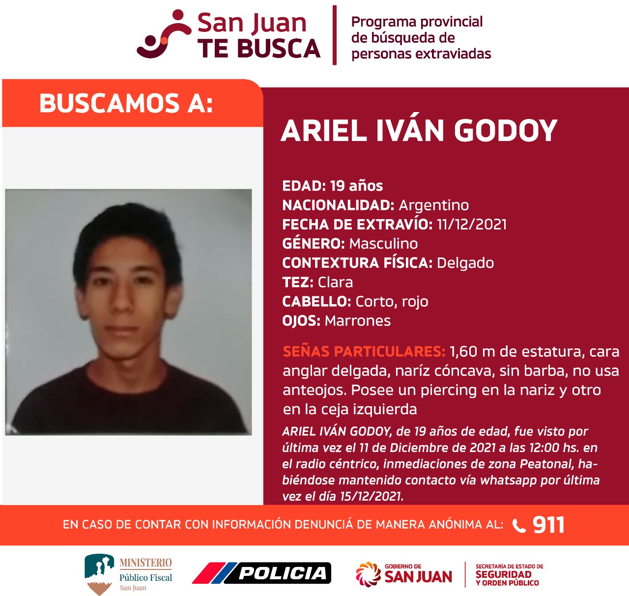 A través del Programa provincial de búsqueda de personas extraviadas, pidieron la colaboración de la sociedad para dar con Ariel Iván Godoy, de 19 años, quien fue visto por última vez el 11 de diciembre, sobre el mediodía, en inmediaciones de la Peatonal.