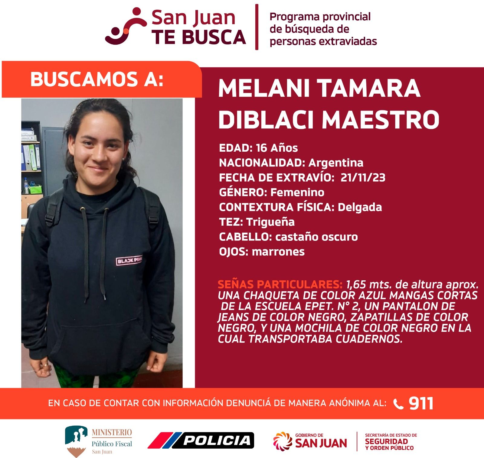 Se trata de una chica de 16 años que no volvió a su hogar y no se sabe nada desde ayer. Fue identificada como Melani Tamara Diblaci Maestro
