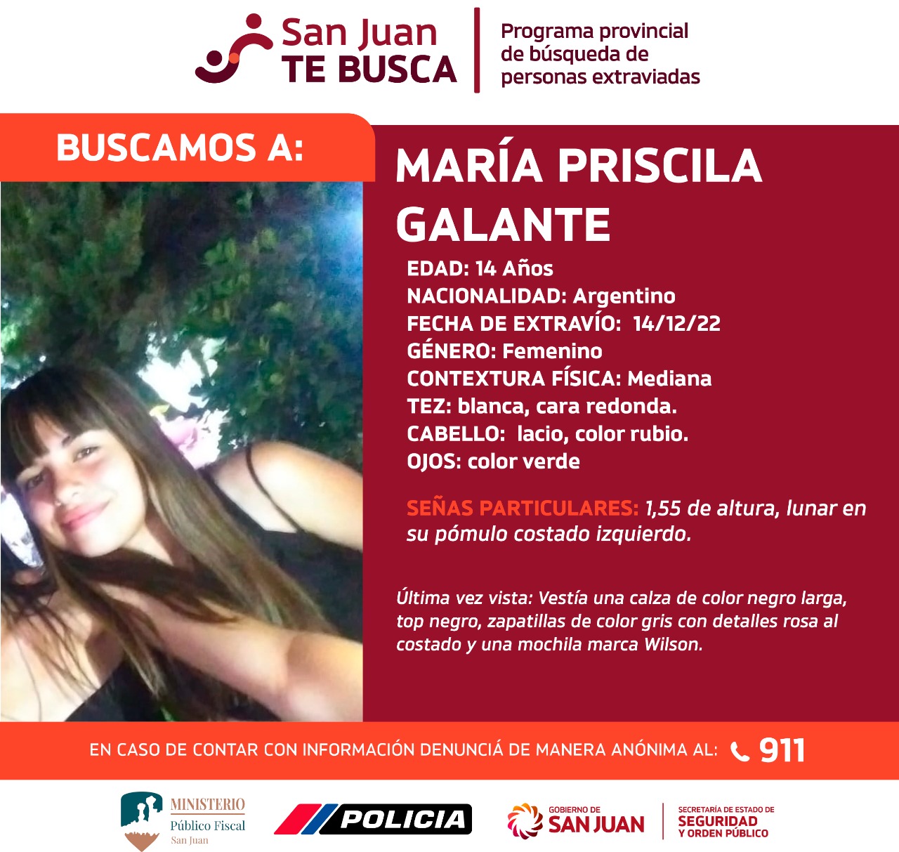 A primera hora de la mañana de este jueves, desde el Programa Provincial de Búsqueda de Personas Extraviadas emitieron un comunicado a través del cual piden ayuda a la población para tratar de dar con el paradero de María Priscila Galante, una joven sanjuanina de 14 años.
