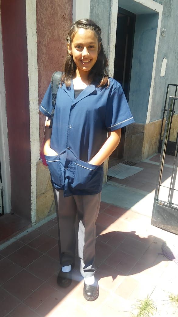 La niña vestía uniforme de la Escuela Enología, tal como aparece en la imagen y una camisa blanca con cuadros rojos, debajo del mismo.