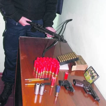 Un joven de 22 años fue apresado ayer en la mañana por policías del grupo GERAS y de la comisaría 25ta., dirigidos por el comisario inspector Hugo Tello y el subcomisario José Marín, porque en su casa de La Bebida, Rivadavia, le hallaron 50 cartuchos calibre 45, 42 cartuchos calibre 12, una pistola calibre 22 (con una bala en recámara), una pistola Bersa calibre 45 y una ballesta con 3 dardos (foto), dijeron en la policía.