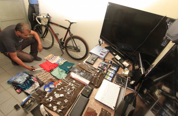 Ropa, 5 pares de zapatos, joyas de plata y oro, 11 celulares, una netbook, una notebook, un equipo de audio, 2 TV LCD (uno de 42’ y otro de 32), un tensiómetro, 3 pendrives, una costosa bicicleta de carrera y una réplica de una pistola 9 mm. Esa es la evidencia que incautaron en los barrios Teniente Silva, Rawson, y Costa Canal III, Capital, efectivos de Robos y Hurtos a un sujeto, ahora vinculado en por lo menos 11 asaltos cometidos en comercios del microcentro capitalino, informó la Policía. Además, cayó su novia porque tenía un pedido de captura por una estafa, dijeron. Los pesquisas al mando del comisario Carlos Castillo apresaron el lunes a las 21 a Sebastián Eduardo Ochoa (27) con la réplica de la 9 mm antes de que asaltara otro comercio de Laprida, casi Rioja, Capital, informó la Policía.