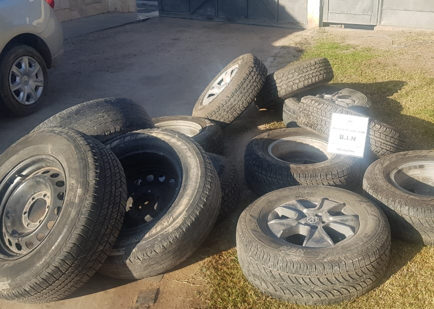 Policías de la Brigada Norte, a cargo del oficial principal Sergio Barrionuevo, concretaron ayer allanamientos en Rivadavia y Rawson y apresaron a dos sujetos por robar ruedas de auxilio de vehículos de alta gama en el Gran San Juan. Les secuestraron 11 ruedas completas y un auto VW Senda en el que cargaban lo robado, dijeron fuentes policiales.