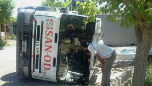 Según fuentes policiales, el hecho se produjo cerca de las 10 en calle Jujuy, en el interior del Barrio Dique de Ullum. Un camión Iveco de la firma San-Od transportaba un módulo perteneciente a la escuela René Favaloro cuando, por ser más alto que los cables de alta tensión, se enganchó y la carga presionó para que el vehículo volcara.