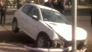 San Juan, 24 de Agosto.- Esta mañana dos automóviles protagonizaron un importante accidente de tránsito en calles Brasil y Echeverría, en Capital. Como consecuencia del choque, uno de los autos impactó de lleno contra un poste de la luz, donde segundos antes se encontraba una canillita.