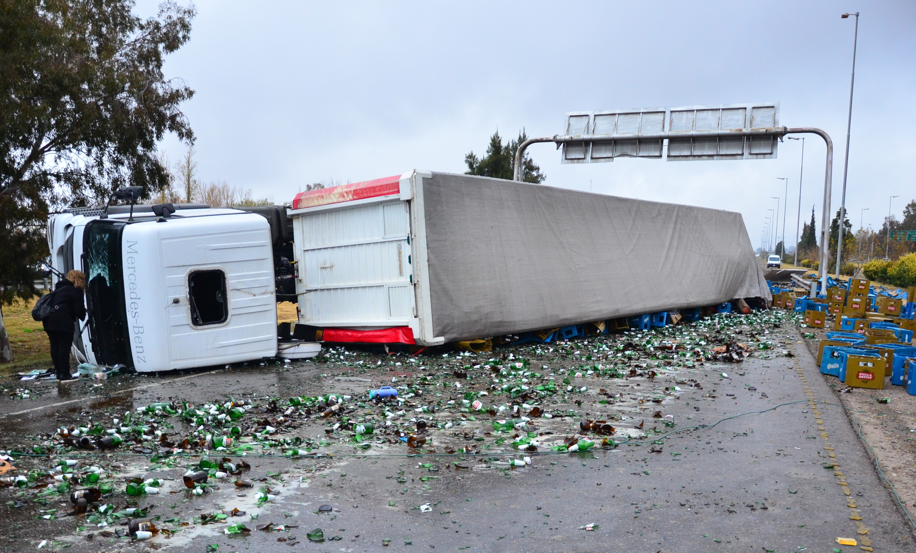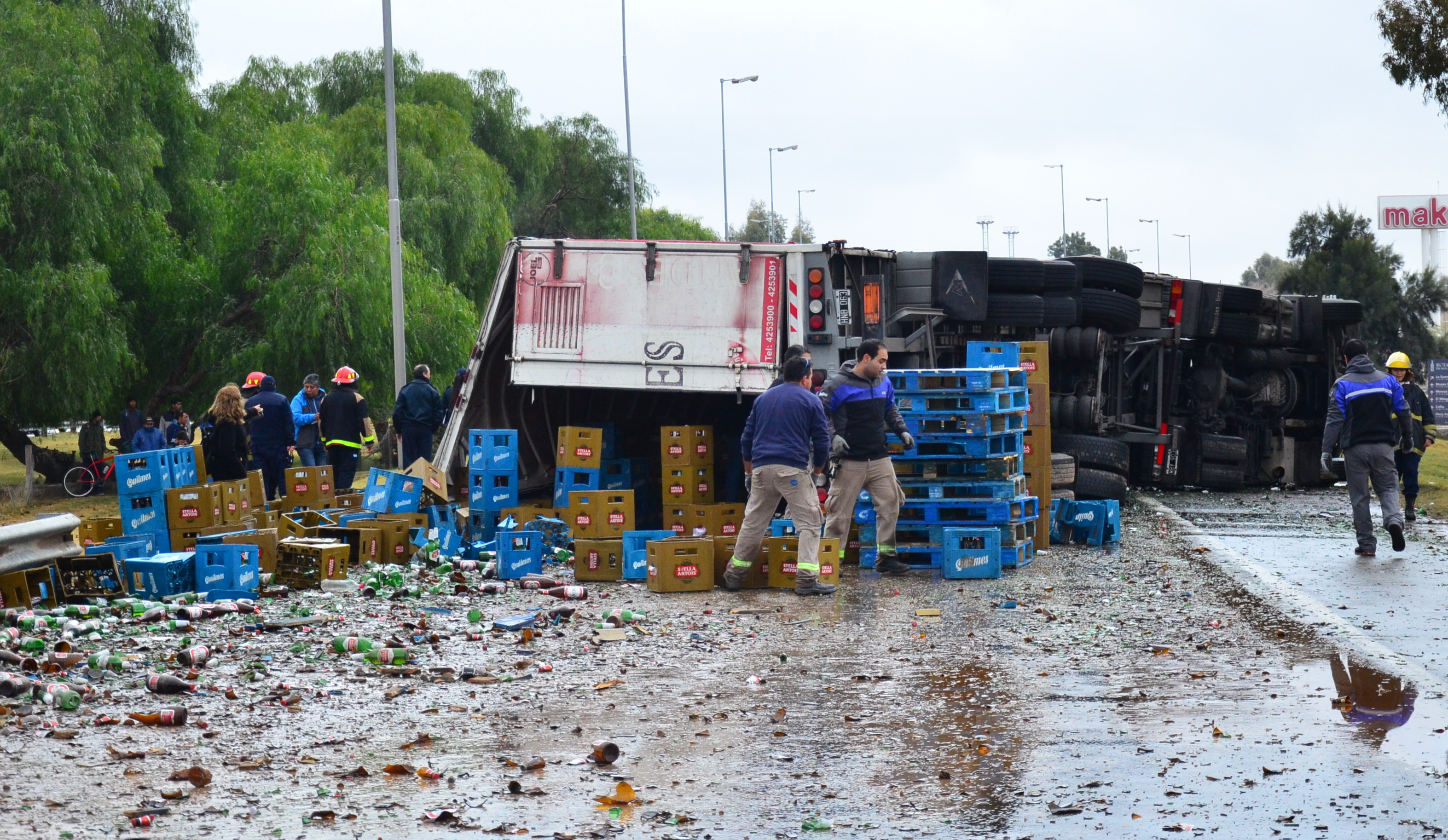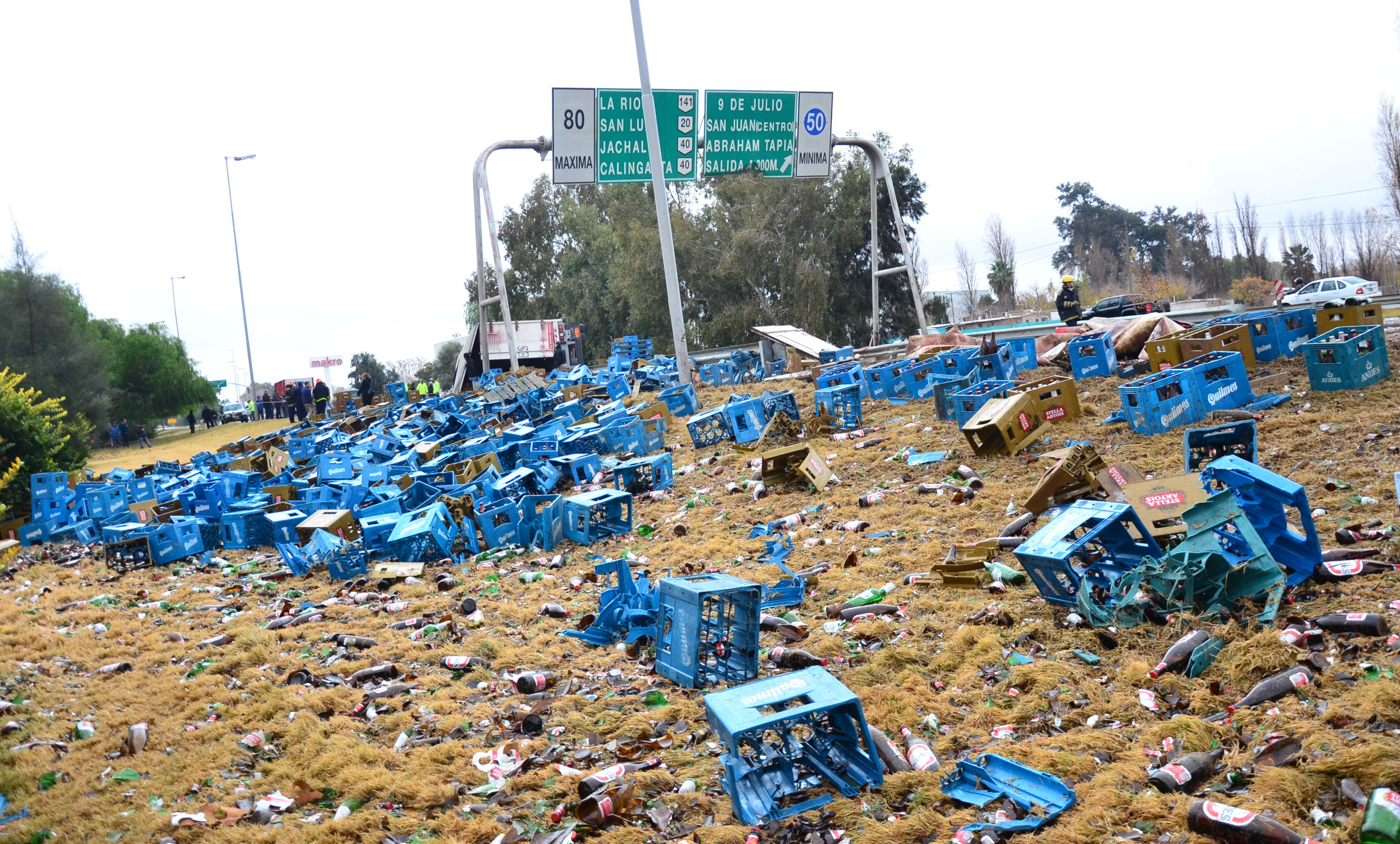 La carga venía de Mendoza en un Mercedes Benz con semiacoplado conducido por Armando Palacio (42). Las hipótesis de la Policía eran que el chofer quiso esquivar a otro vehículo o se durmió y que luego dio un volantazo que derivó en el vuelco, ocurrido ayer cerca de las 12 en ruta 40, entre calles Elcano y Putaendo. La carpa del acoplado sujetó parte de la carga, igualmente los cajones cayeron sobre el pavimento y miles de botellas estallaron. El único herido fue el chofer, que salió golpeado y fue rescatado de la cabina por Bomberos de Rawson.