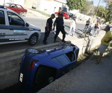 Una mujer a bordo de un Peugeot 205 se llevó un gran susto ayer a las 11.30 luego de caer dentro de un canal sin agua que pasa por el costado Norte de calle Sarmiento, al Oeste de Balaguer, en Santa Lucía. En la Policía indicaron que la automovilista (no fue identificada) era remolcada por su marido en otro vehículo y cuando pasaron ese cruce, la dirección del Peugeot se trabó y cayó al canal, indicaron en la fuerza.