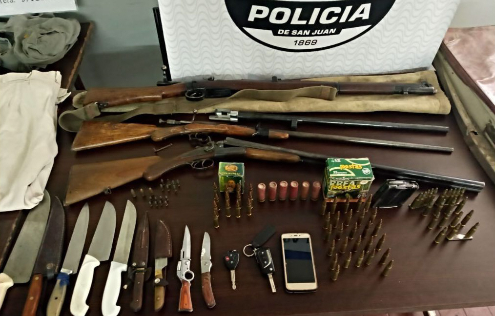 Un joven de 26 años fue detenido en un operativo conjunto entre policías de la seccional 18va y la seccional 21 de Jáchal, porque en su casa de Las Lomitas, Albardón, tenía sin autorización cuatro armas largas (escopetas, un fusil, una carabina), nueve cuchillos y 89 municiones de distinto calibre. En el operativo, también incautaron dos camionetas en las que el sospechoso, Jorge Troncoso, y otros sujetos fueron avistados por un puestero de Mogna, Jáchal, que los grabó con su celular antes de denunciarlos porque se habían metido a su propiedad sin su autorización a cazar animales. Según la Policía, el puestero denunció haber sido amenazado y haber hallado restos de varios animales.