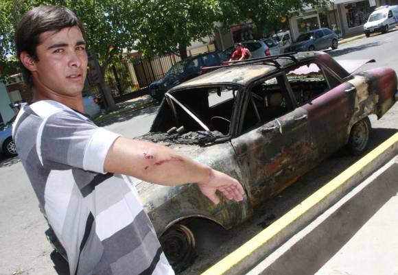 ‘Nos chocó y rodamos por el piso. Me paré como pude a pedirle ayuda al tipo, pero arrancó el auto y arrastró mi moto como dos cuadras hasta que los dos vehículos se prendieron fuego. Ahí el tipo se bajó y se fue caminando como si nada’. Aún sorprendido, explicaba ayer Luciano Barrera (20 años, empleado de una panadería) la increíble reacción que tuvo un automovilista luego de embestirlo a él y a su primo cuando circulaban en moto el sábado en la noche por un cruce de Villa Krause, en Rawson. Según Barrera y la policía, el sujeto circulaba en contramano y en estado de ebriedad cuando los embistió. Luego arrancó su rodado de nuevo, arrastró decenas de metros la motocicleta hasta que empezó arder, junto con su auto. Lo insólito es que allí, el conductor se bajó y huyó de la escena caminando.