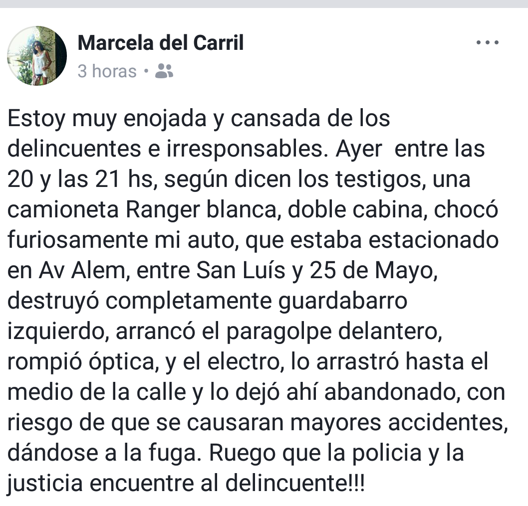 La mujer, furiosa, se descargó en Facebook. "Estoy muy enojada y cansada de los delincuentes e irresponsables", escribió, y agregó que ruega que "la Policía y la Justicia encuentren al delincuente".