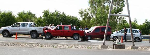 Los seis vehículos eran parte de la caravana de un cortejo fúnebre que enfilaba hacia el cementerio de 9 de Julio. A las 10.30 de ayer todos circulaban por la avenida de Circunvalación y pretendían tomar el empalme hacia la ruta 20, pero un error de cálculo involucró a todos en un dramático choque en cadena por una frenada imprevista, que al final dejó cuatro heridos leves, según la Policía (foto). Un Peugeot 306, una Toyota Hilux, una Ford Ranger, una Peugeot Partner, un Chevrolet Meriva y otra Hilux fueron los vehículos dañados.