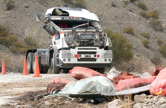 Un camión Fiat Iveco cargado con unos 37.000 litros de gas oil terminó destrozado luego de chocar ayer a las 5:30 contra un cerro ubicado sobre la ruta 149 que va a Iglesia, a la altura de Las Crucecitas, en Ullum. Según la policía, Claudio Gustavo Gómez (31) traía el combustible desde Luján de Cuyo, Mendoza, con destino final a la mina "Veladero", Iglesia. Al parecer, un problema en los frenos habría provocado que Gómez no pudiera evitar el choque contra la pared de una montaña no muy grande, al costado de una curva poco pronunciada, dijeron. El impacto hizo que se derramaran varios litros de la carga, sin mayores riesgos para el chofer, dijeron en la policía.