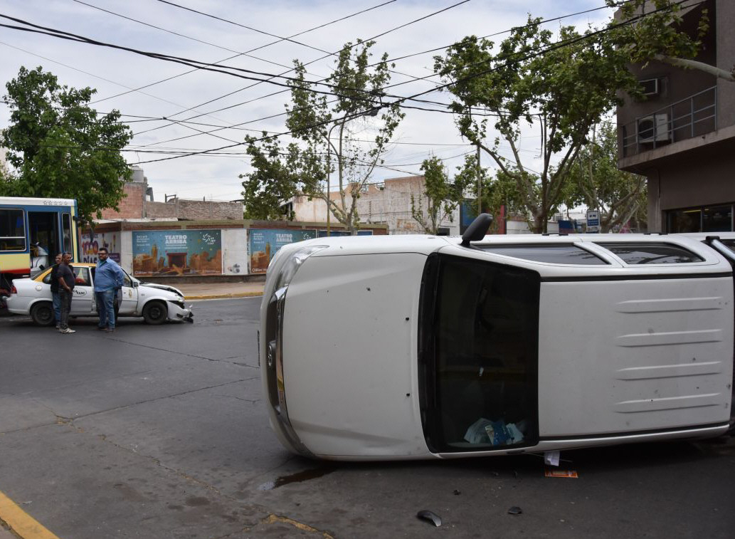 El conductor de una Toyota Hilux, dos mujeres y el bebé que llevaban sufrieron alrededor de las 14,30 de ayer distintas lesiones luego de chocar con un remís Chevrolet Corsa y volcar en pleno centro. El auto tenía prioridad de paso y circulaba por Santa Fe al Oeste. La camioneta iba al Norte por Jujuy, dijeron fuentes policiales. Las identidades de los implicados no fueron divulgadas por la Policía.