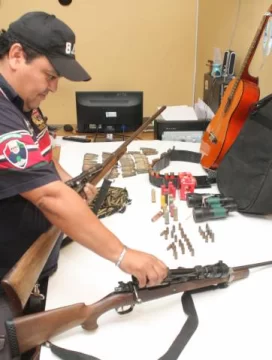 Un sujeto de apellido Saavedra (43), fue apresado ayer en la tarde por policías de la Brigada Sur en el barrio Las Piedritas II, en Quinto Cuartel, Pocito, porque tenía en forma ilegal una escopeta calibre 16 con mira telescópica, una carabina Mauser con mecanismo de fusil y unos 150 cartuchos de guerra de diferente calibre. También le secuestraron, una guitarra, unos prismáticos y un par de patines, informó la Policía.