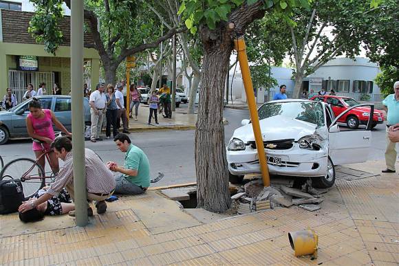 El semáforo en funcionamiento y otra norma implícita: un límite de velocidad no mayor a 40 km por tratarse de una zona urbana. La teoría indica que el cumplimiento de esas exigencias legales mínimas para circular en la ciudad sirve para evitar cualquier imprevisto (salvo fallas mecánicas) o problemas en el tránsito, pero ayer a las 17.30, por enésima vez, una infracción vial por poco no provocó un desastre en un cruce de calles capitalino. Según la Policía, en Aberastain y General Paz, Marcelo Rabbia (40) y su mujer Noelia Cerri (31, embarazada de 3 meses), terminaron con cortes y otras lesiones menores luego de estrellarse y derribar un semáforo cuando transitaban en su Chevrolet Corsa hacia el Este por General Paz.