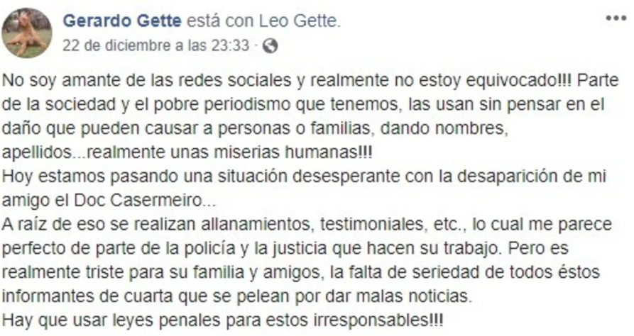 Mientras la investigación toma forma, algunos detalles de lo que sucedió durante los siete días de búsqueda llaman la atención. Uno, por ejemplo. El mensaje publicado el domingo por el ahora detenido en su cuenta de Facebook. Allí considera un "amigo" al ginecólogo y acusa a los medios y a parte de la sociedad de acusar falsamente por las redes sociales. Es que en ese momento ya se hablaba de su posible vinculación con el hecho.