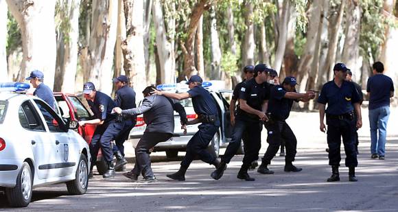 Cómo perseguir a un delincuente a elevada velocidad sin chocar ni dañar nada ni atropellar inocentes. Cómo custodiar a una personalidad importante ante el hipotético ataque de una persona armada en medio de una multitud. Cómo reducir a los delincuentes que huyen en auto, lo abandonan y se meten a una casa de familia. Cómo frenar el ataque de un malviviente armado. Cada situación fue simulada ayer en el camping El Pinar, Rivadavia, por los 50 policías que durante 6 meses recibieron capacitación desde la misma fuerza para desempeñarse con éxito en situaciones extremas, principalmente en el manejo de vehículos, y así mejorar su trabajo en la prevención y la lucha contra el delito. Según el director del D-6 (Dirección de Institutos) y coordinador académico del curso, comisario mayor Eduardo Lirola, es la primera vez que se realizan esas prácticas de perfeccionamiento en la institución policial.