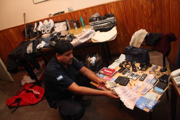El dato aportado por un hombre amenazado por el presunto asaltante, no falló. La información hablaba de que un reo, con salidas transitorias de lunes a sábados, no usaba ese beneficio para ir a su casa y ver a su familia, sino para salir a asaltar en moto por diferentes zonas del Gran San Juan. Cuando los efectivos de la comisaría 30ma., al mando del comisario inspector José Antenor Olivera, llegaron ayer en la mañana a su casa, esperaron a que el preso llegara a su vivienda de Chimbas y allanaron el lugar. Adentro, los uniformados confirmaron el dato y encontraron de todo: $3.000 y otros 400 falsos, algunos dólares, joyas, 5 carteras, dos DNI, 4 pares de zapatillas, 2 DVD, un microondas, 4 cascos, varias películas, 9 celulares, ropa, tarjetas telefónicas, una cartera de la firma "Amodil", folletería de una heladería "Grido", proyectiles calibre 22, 32 largo y corto, bijouterie, dos motos Guerrero 150cc. y 110cc., y otras cosas (foto), dijeron en la policía.