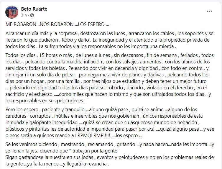 Luego pasó a contar todo el esfuerzo que hace para mantener el negocio: "Todos los días , 15 horas o más , de lunes a lunes , sin descansos , fin de semana , feriados , todos los días , peleando contra la maldita inflación , con los salvajes aumentos , con los afanos de los servicios y todas las boletas . Peleando por vivir en decencia y dignidad , con todo en contra , y sin dejar ni un solo día de pelear , por negarme a vivir de planes y dádivas , peleando todos los días por un hogar , por una familia , por tres hijos que estudian y deben tener un mejor futuro ….peleando en dignidad todos los días para ser robado , dañado , violado en el derecho , en el sacrificio y el esfuerzo …..como miles que hacen lo mismo y que son ultrajados todos los días …y los responsables en sus pelotudeces . (sic)".