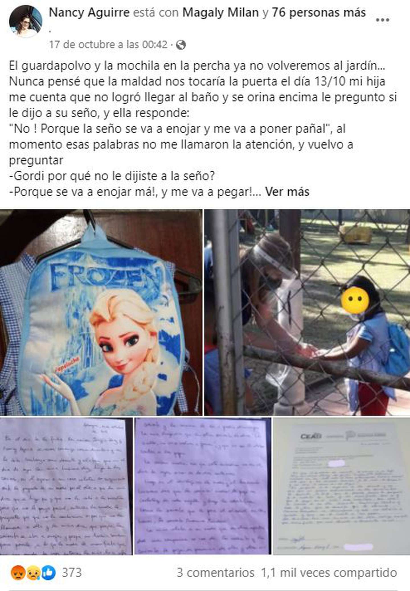 “El otro día me hice pis y ella me pegó”, fueron las palabras que Nancy Aguirre escuchó de boca de su propia hija, según relató en su cuenta de Facebook y más tarde en una nota con el portal El Diario Sur. Y agregó: “Después de lo que me dijo comencé a indagarla porque me asusté y me dijo que la seño Mónica se enojó porque se le escapó el pipí y le pegó una cachetada. Me quedé en shock”.