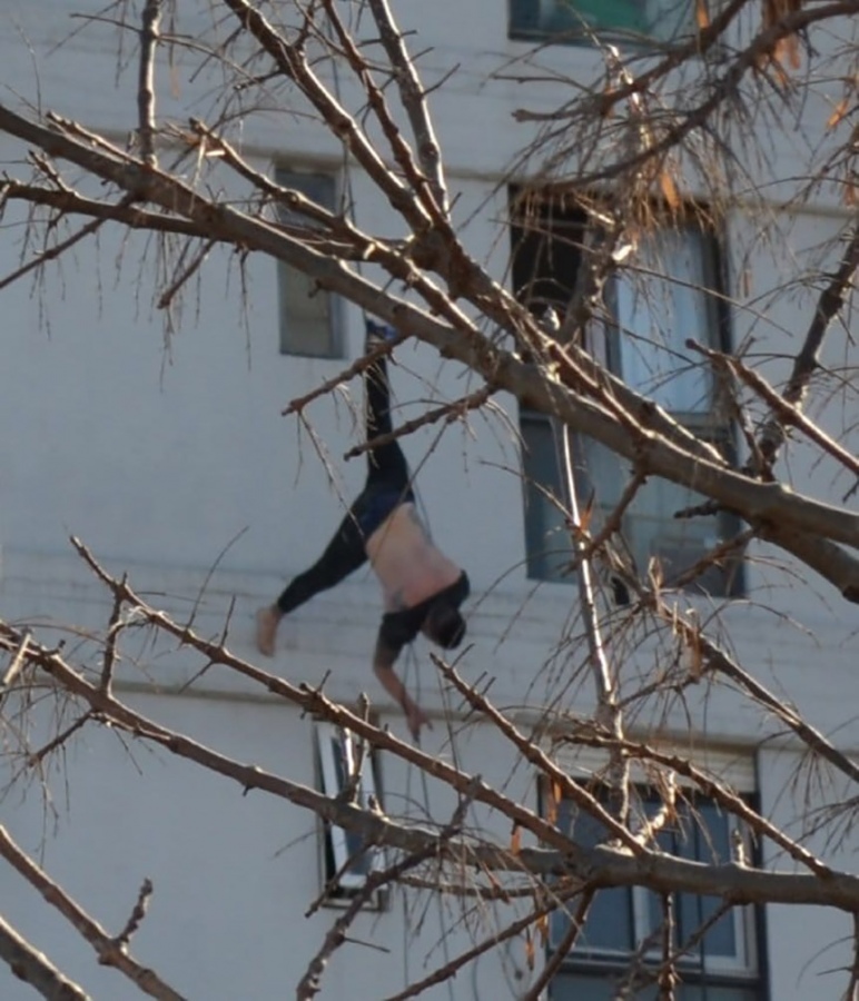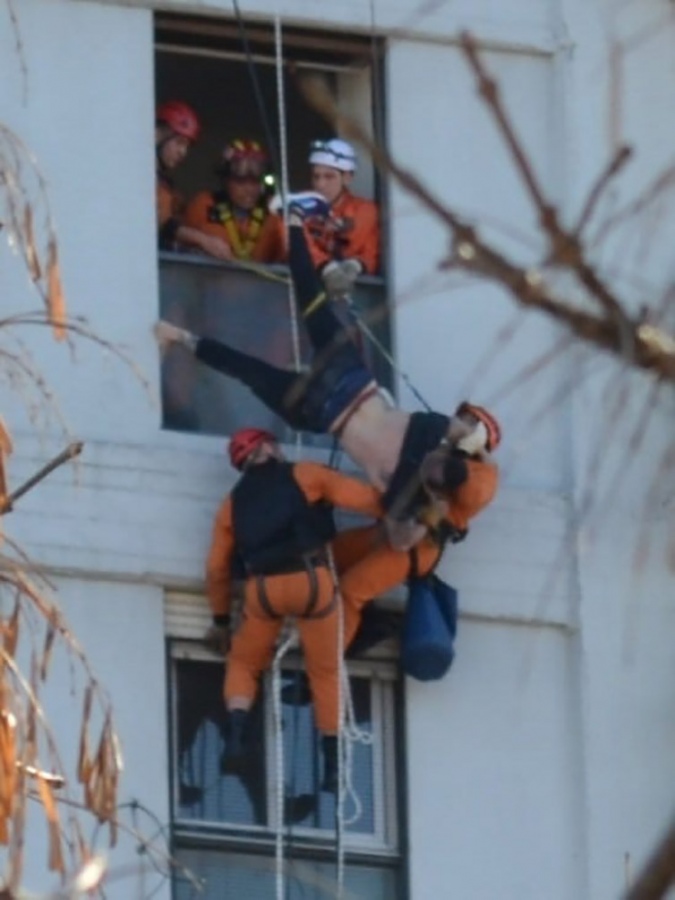 Al llegar al lugar, varios vecinos avisaron que un hombre estaba colgado de los cables que daban al pulmón del edificio, por lo que rápidamente se solicitó la presencia del Grupo de Rescate de los Bomberos de la Ciudad.