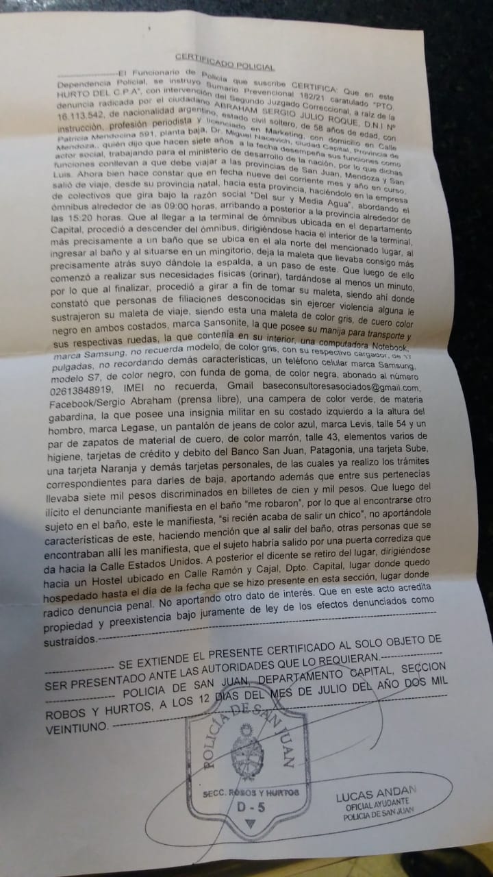 En la que pudo radicar en la mañana de hoy lunes, declaró que dentro de la valija llevaba su notebook, teléfono celular, billeteras con tarjetas y una suma en efectivo de 7.000 pesos, por lo que quedó incomunicado y varado.