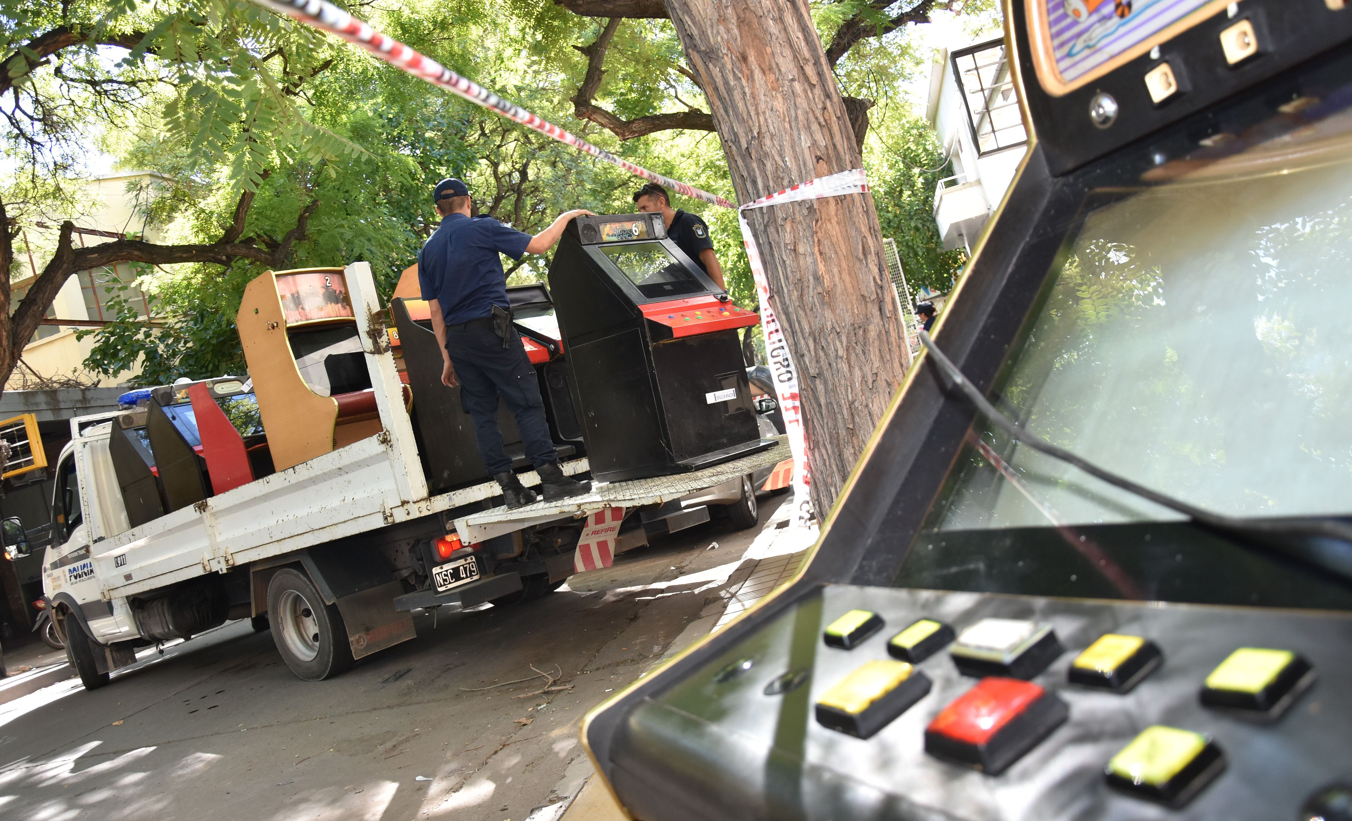 Evidencia. Policías de la Seccional 1ra, al mando del comisario inspector Gregorio Díaz y el comisario Juan Soria, trasladaron todas las máquinas de apuestas.