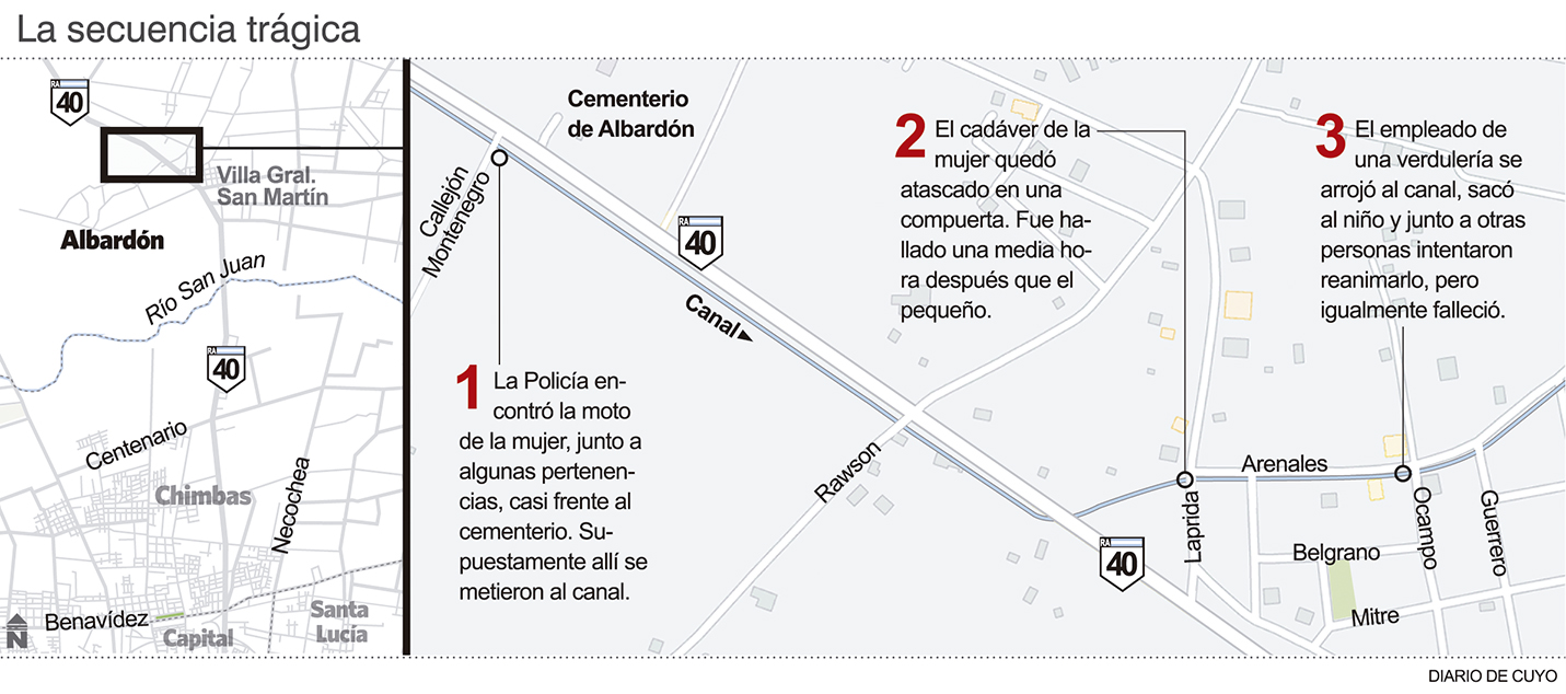 Las víctimas se llamaban Jacinta Reinoso (60) y Taylor Facundo Páez (5). En la Policía están convencidos que detrás de la tragedia no hay nada extraño y que simplemente se trató de un accidente. Una alta fuente policial afirmó que las víctimas se habían metido al canal para refrescarse luego de una mañana de compras en el centro de Albardón. La hipótesis es que cuando regresaban a la casa de la mujer, en la Villa Villicum, decidieron parar para bañarse en el canal. Eso fue en el costado Oeste de la Ruta 40, a la altura del callejón Montenegro, casi frente al cementerio. En ese lugar fue hallada estacionada la moto Corven Mirage 110cc de Reinoso junto a bolsas de compras, algunas prendas y las ojotas del pequeño Taylor. El rodado tenía la llave colocada y a un costado además había una billetera con dinero. Todo indica que era un chapuzón y listo. A esa peligrosa y prohibida aventura, según declaró un hijo de la señora, ya la habían practicado antes, pero esta vez todo terminó de la peor manera.