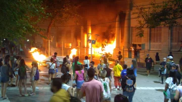 Alrededor de las 21, el mismo grupo que produjo los daños en el edificio de Virgen del Carmen de Cuyo, llegó hasta la Casa de las Leyes, en Peatonal y Patricias, y prendió fuego en el lugar.