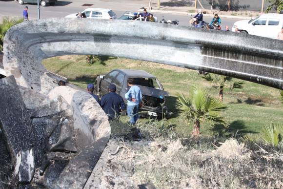DOBLADO Y PARTIDO. Así quedó a las 8,20 de ayer el guardarrail del costado Sur de avenida de Circunvalación, metros al Este del puente con Necochea, en Santa Lucía. Fue por el impresionante choque que le dio en un Peugeot 405 un joven identificado en la policía como Pablo Valetín Fernández (21), quien fue a parar al fondo del terraplén. Según la policía, sufrió traumatismo facial y otras lesiones, pero a las pocas horas volvió a su casa.