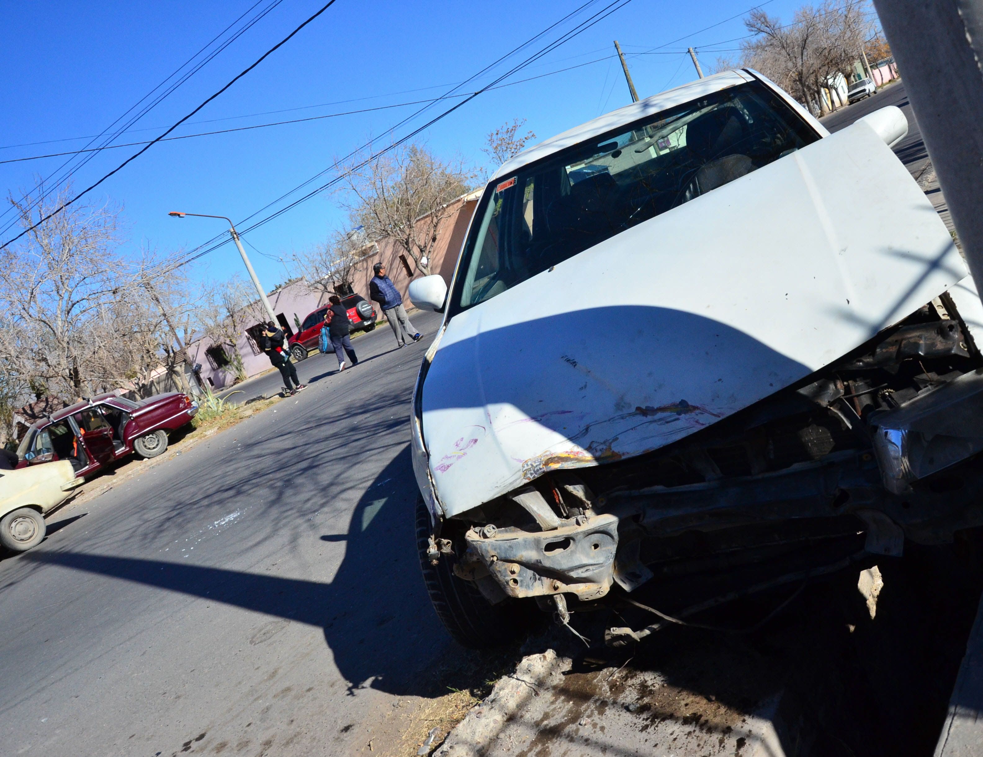Y a las 10.45, en Misiones y Castaño, Rawson, chocaron un VW Polo y un Ford Falcon. En el VW iba Alfredo Salinas (57) y en el Falcon Roberto Aballay, Rosana Fernández (48) y un nieto de 1 año. Tras el choque, el Ford casi colisiona con una vivienda y el otro auto cayó a una cuneta.