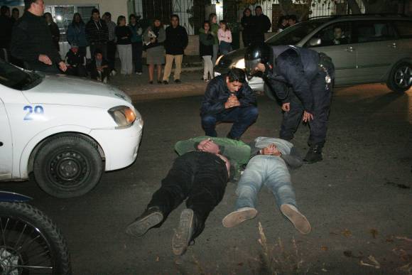 Dos sujetos señalados como autores de varios asaltos a mano armada, fueron detenidos a las 20.45 de anoche en Hipólito Yrigoyen (conocida como San Miguel) cerca de Ituzaingó, Rivadavia, luego de ser perseguidos por los agentes Raúl Bustos y Gerardo Malla (Motorizada III), quien de inmediato tuvieron el apoyo del Comando Radioeléctrico. Ambos sospechosos, identificados como Enzo Gerardo Alvarez (25) y Germán Cristian Araoz (21) tenían una pistola de aire comprimido similar a una 9mm. y se movilizaban en una moto Cerro 110cc. El asalto a una estación de servicio, a una farmacia, a un comercio del microcentro y a una casa de accesorios, son algunos de los numerosos golpes que complican principalmente a uno de ellos, Alvarez, de gran contextura física (foto).