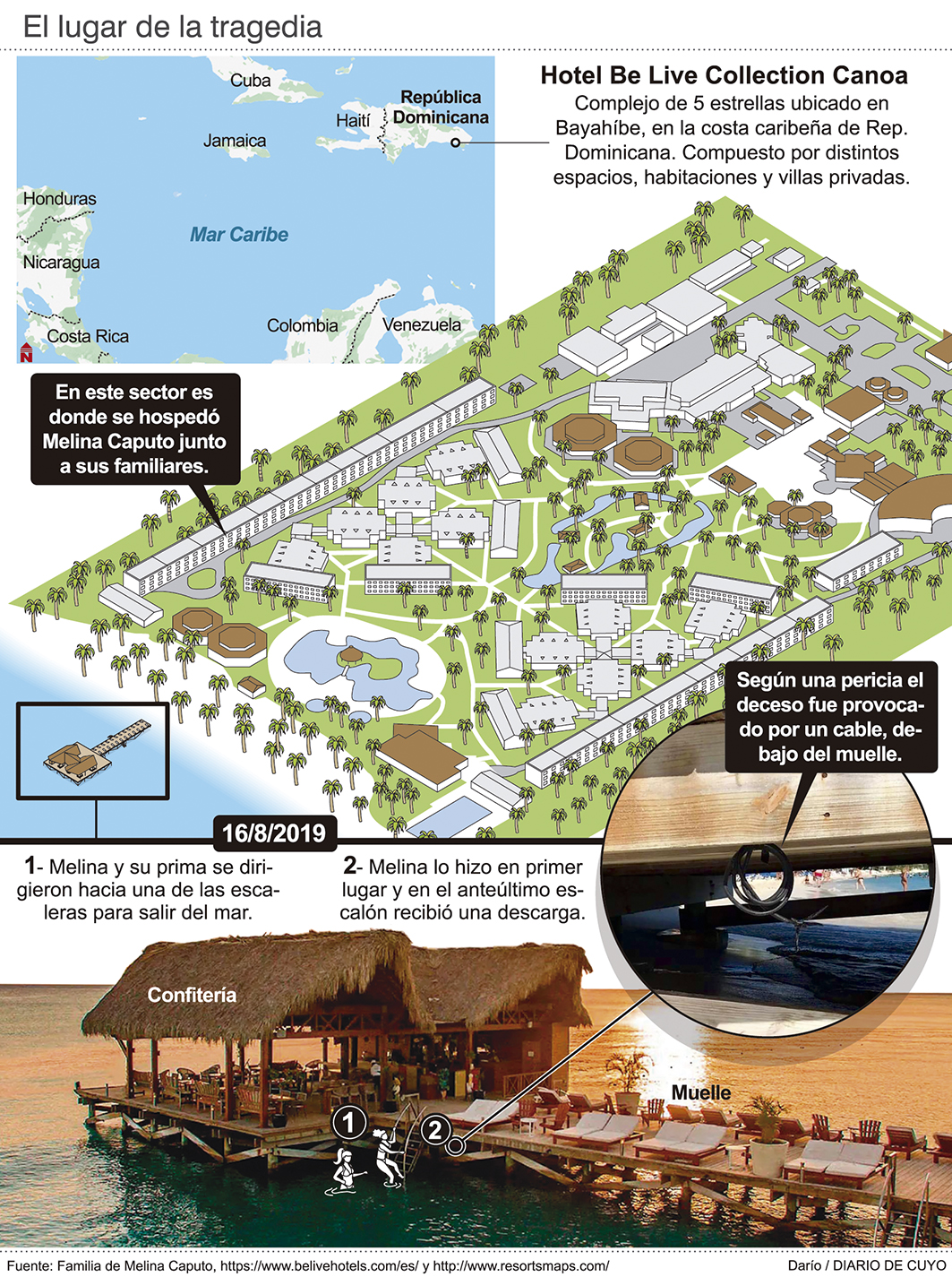 La vida de la sanjuanina Melina Caputo fue arrebatada el 16 de agosto de 2019 en el exclusivo Hotel Be Live Collection Canoa de Bayahíbe, un paraíso en la costa del Caribe de República Dominicana, donde vacacionaba con su abuela paterna, cuatro primos y dos hermanos. Recibió una descarga eléctrica cuando subía las escaleras de un muelle y fue fulminante (ver infografía). Tenía 17 años, cursaba sexto año en la Escuela Modelo y le quedaba nada para recibir el título de profesora de danzas españolas. Era su año. Eso pintaba, porque después de Dominicana se iba de crucero con amigas y cerrando el calendario tenía su fiesta de egresados, que la tenía desvelada. También la tenía muy ocupada la elección de su carrera: proyectaba irse a Córdoba a estudiar Medicina pero no estaba muy convencida.
