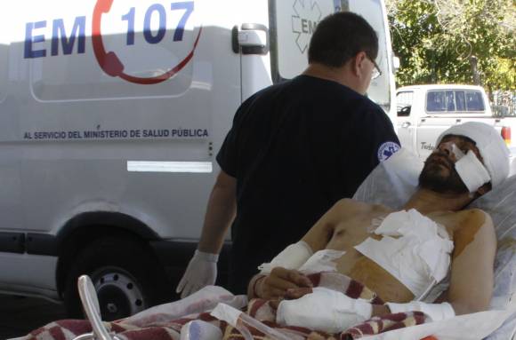 La versión policial es que los frenaron 400 m antes de llegar hasta donde estaba la otra hinchada. Al ver que empezaban a insultarse, ordenaron a la barra ‘Quemera’ que siguieran su marcha; pero por el contrario, descendieron de los colectivos y se avalanzaron contra el otro contingente. Del otro lado, también bajaron de los micros y de un segundo a otro se armó una batalla campal. Los 9 policías que habían no pudieron frenar la batahola. Algunos barras se trenzaron a trompadas, también llovieron las piedras y no faltaron las armas blancas y los tiros. Hubo heridos en ambos bandos: los más graves fueron Leandro Alejandro Castro (26), de Morón, que recibió un balazo en el abdomen, y Pablo Rodríguez (28) de Huracán, que terminó con un tiro en el abdomen, un puntazo en el tórax y golpes en el rostro, confirmó la Policía. Ambos fueron operados en el Hospital Rawson y anoche estaban fuera de peligro. Otros lesionados no se quisieron hacer atender. El enfrentamiento pudo ser peor, ya que en esos momentos iban llegando otros 8 colectivos, 2 combis y 5 vehículos más con hinchas de Morón, por lo que la barra de Huracán se subió a sus micros y se alejó. Desde la Policía indicaron que fue imposible identificar a los agresores, de modo que no hay detenidos y tampoco secuestraron las armas.