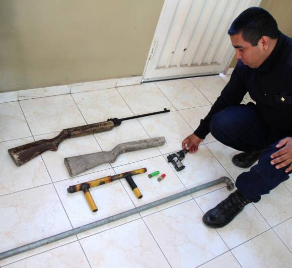 Los policías de la Subcomisaría del B° Cipolletti, al mando del subcomisario Gustavo Caño y el principal Julio Aballay, detuvieron ayer a un adolescente de 15 años y a un sujeto llamado Facundo Quiroga (18), en cuyos domicilios hallaron una ‘tumbera’ adaptada para cartuchos de escopetas calibre 12.70, un rifle de aire comprimido, la réplica de una pistola, 2 cartuchos y otros elementos, entre ellos un caño para armar otra arma. Los allanamientos se hicieron en los barrios 19 de Noviembre y Siete Conjuntos, Chimbas, tras la agresión que sufrieron dos jóvenes el domingo último.