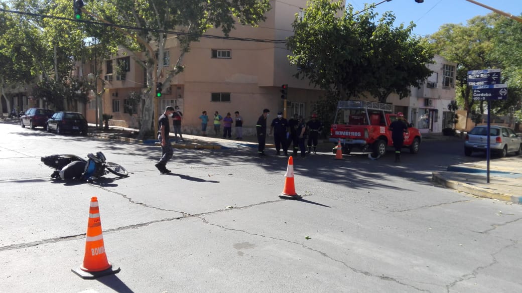 Este viernes, cerca de las 17, una moto en la que iban dos hombres impactó con una dotación de Bomberos en el cruce de calle Entre Ríos y Córdoba, en Capital.