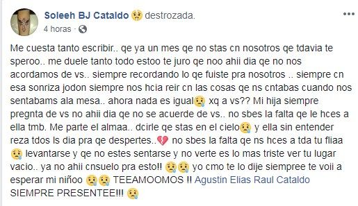 Hace un mes, Agustín Cataldo, de 18 años, murió tras luchar durante 30 días por su salud, luego de haber sufrido una brutal golpiza al salir de un boliche en Jáchal. Ahora, su hermana, Soledad Cataldo, lo recordó en Facebook, con un triste mensaje.