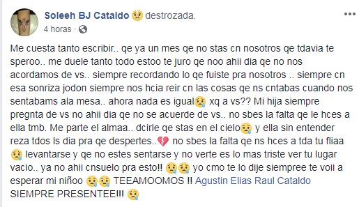 “Ya un mes que no estás con nosotros y todavía te espero”, escribió la joven en las redes. Y agregó: “Ya no hay consuelo para esto. Yo, como te lo dije siempre te voy a esperar, mi niño”.