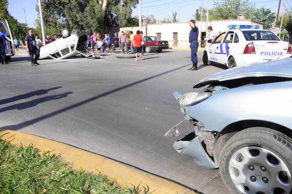 Un Renault 6 colisionó con un Peugeot 206 y volcó. Sin embargo eso no fue todo, ya que luego de dar un giro, la renoleta se llevó por delante una moto, que ya no tenía a su conductor arriba porque se tiró al suelo al ver que el vehículo se venía encima.