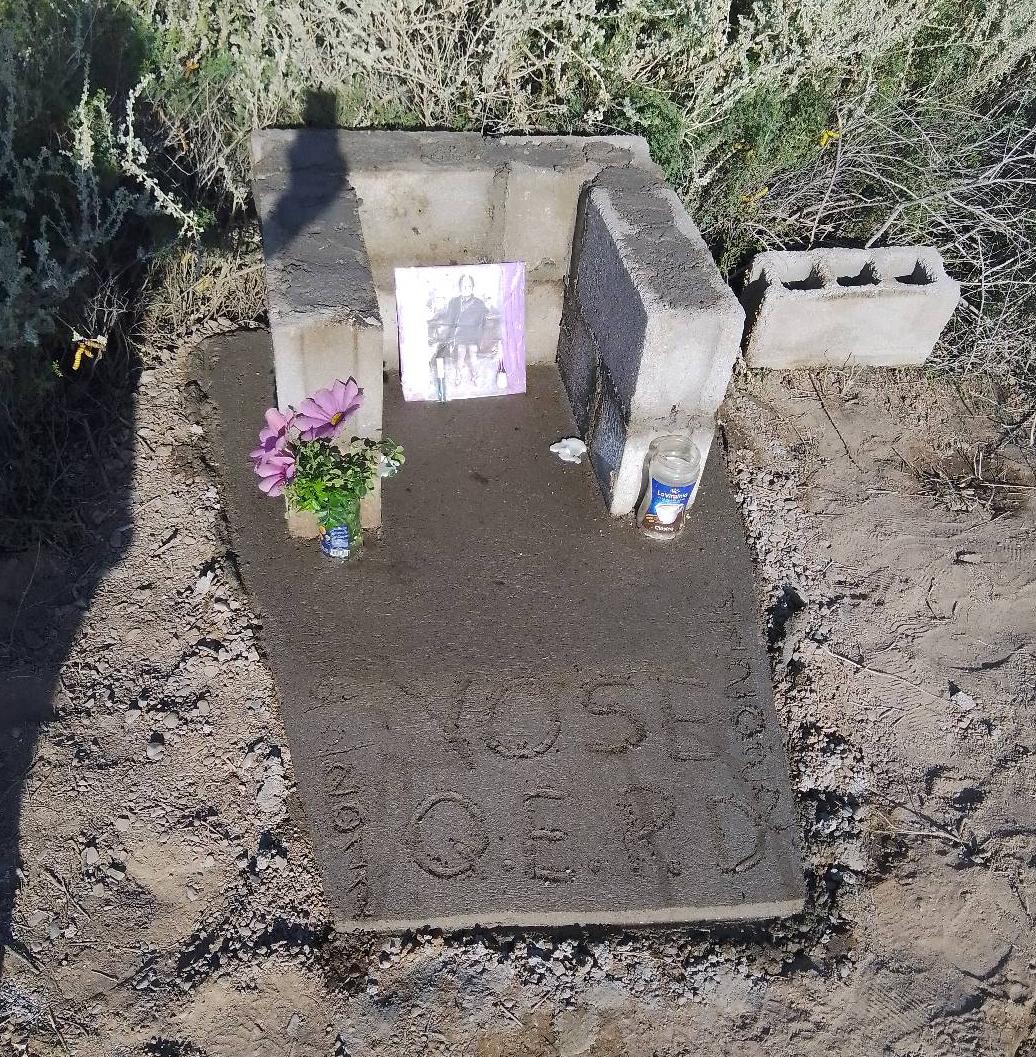 "Yose. QEPD. 2002", se lee en la placa de cemento que construyeron sobre la tierra, en medio de un descampado de Media Agua, los familiares de la nena. Sobre ella, se puede ver una foto de la criatura y, a los lados, frascos con flores.