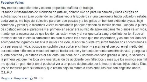 Federico Valles es un chofer sanjuanino que circulaba por la zona de la tragedia, instantes después del accidente que se cobró la vida de tres menores, esta mañana, en Jocolí. En su cuenta de Facebook, el hombre hizo un conmovedor relato de lo sucedido y de cómo fueron retirando los cuerpos de las víctimas y a los sobrevivientes, heridos.