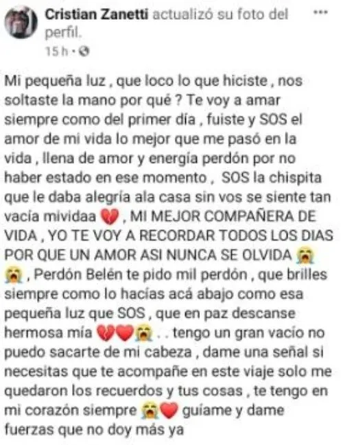 En la posteo realizado desde su perfil de Facebook, Zanetti apuntó a la hipótesis de suicidio. "Mi pequeña luz, que loco lo que hiciste, nos soltaste la mano, ¿por qué?", escribió. "Perdón Belén, que brilles como lo hacías acá abajo (…) Guíame y dame fuerzas que no doy más", agregó.