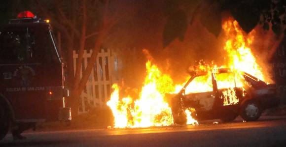 Eran las 7 de la mañana cuando dos jóvenes transitaban hacia el Sur por Hipólito Yrigoyen (más conocida como San Miguel) y una cuadra al Norte de República del Líbano (en el cruce con Marchesi), Rivadavia, debieron bajarse por el humo que salía de la zona del motor. Según un vecino, el conductor identificado en la Policía como Matías Cañada (22) abrió el capot para ver y esa acción sirvió para avivar el fuego. En minutos, el incendio destruyó por completo el Ford Escort. En la Policía creen que el siniestro se inició por una falla a causa de la combinación de nafta y GNC en el auto.