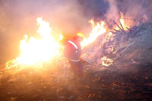 Los Bomberos de la policía y los Voluntarios de Caucete anoche, al cierre de esta edición, ya habían controlado el fuego, pero era tanta la cantidad de leña que ardía que tenían que esperar que terminara de consumirse. Incluso, una máquina con pala cargadora seguía removiendo los montículos de troncos y restos de madera para aislar los focos del siniestro.