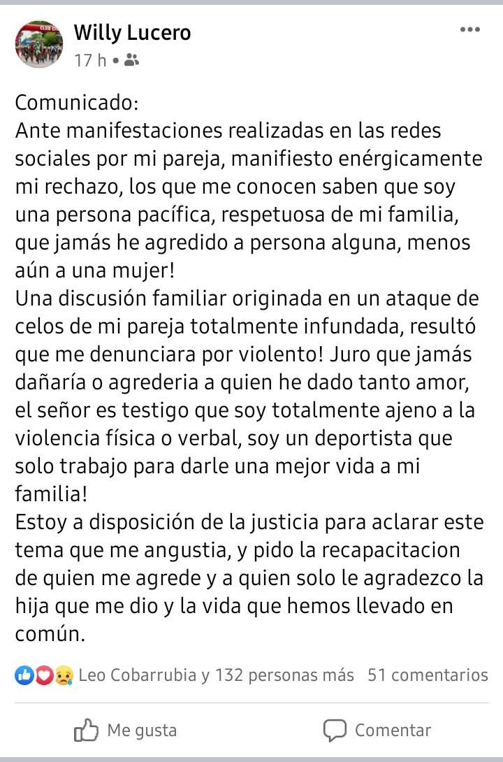 Y agrega, "juro que jamás dañaría o agredería a quien he dado tanto amor, el señor es testigo que soy totalmente ajeno a la violencia física o verbal, soy un deportista que sólo trabajo para darle una mejor vida a mi familia!