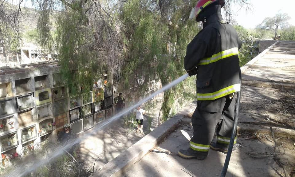 El viernes, alrededor de las 17,30, personal de Bomberos de Caucete recibió un llamado de alerta por un incendio que se estaba produciendo en el interior del cementero del departamento.