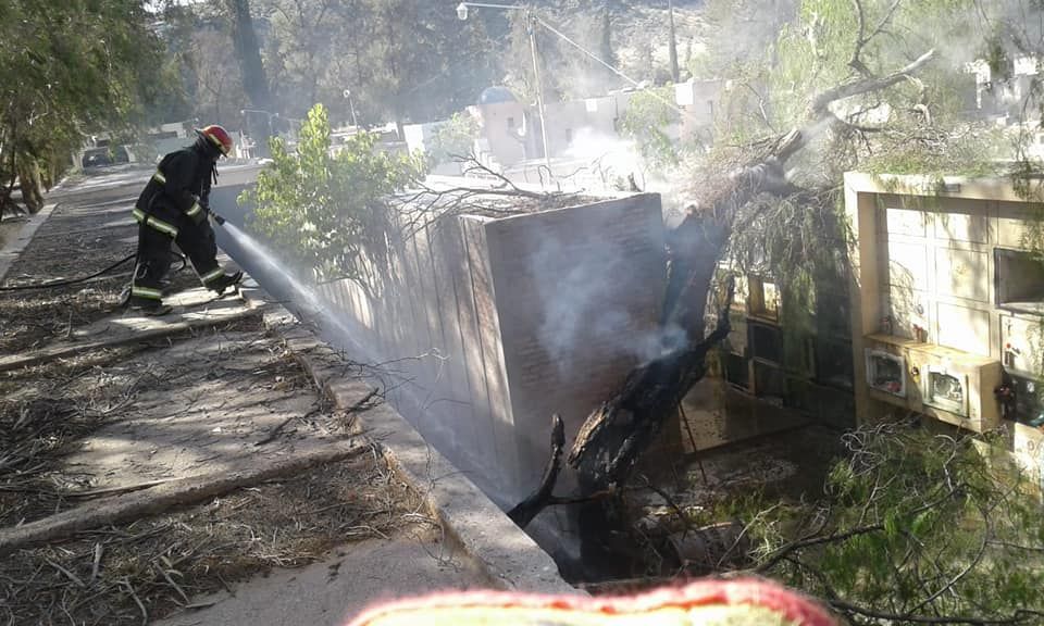 Tras acudir a la urgencia detectaron que un árbol de la especie aguaribay había entrado en combustión y había caído sobre los nichos.