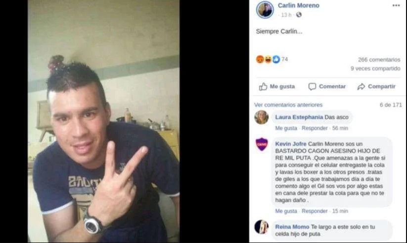 "Siempre Carlín". La frase junto a una foto suya fue el último posteo que apareció en el perfil de Facebook de Carlos Moreno, uno de los condenados por balear en 2010 a Carolina Píparo cuando estaba embarazada y asesinar a su bebé. El detalle que puso en alerta a las autoridades fue que ocurrió un día después de las amenazas denunciadas por la víctima, cuando ya le habían incautado el celular y mientras el preso se encontraba en una audiencia con el director del penal.